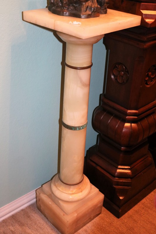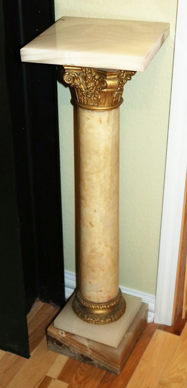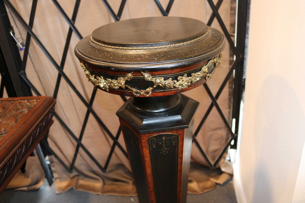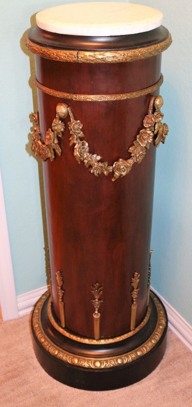 Mahogany Pedestal with gilt bronze ornamentation and white marble top