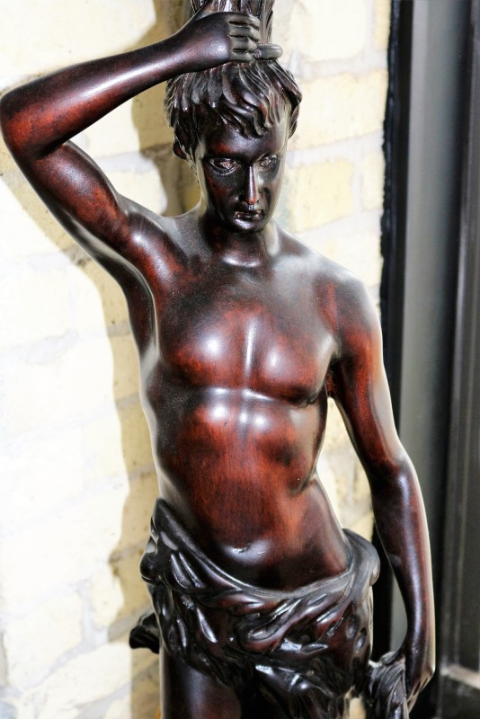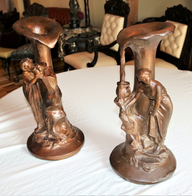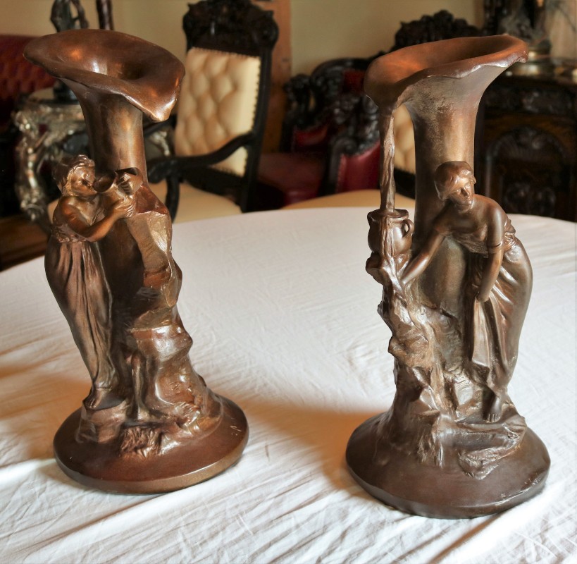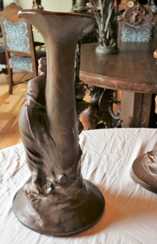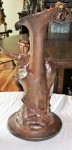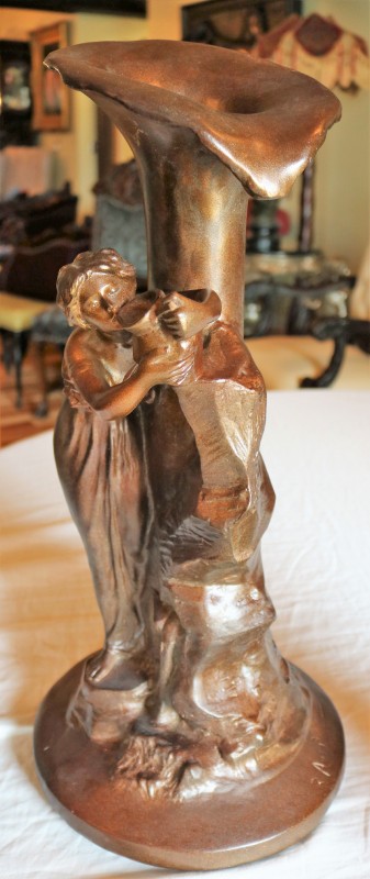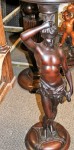 Spelter Woman with carved walnut bowl with brass inlays adornments