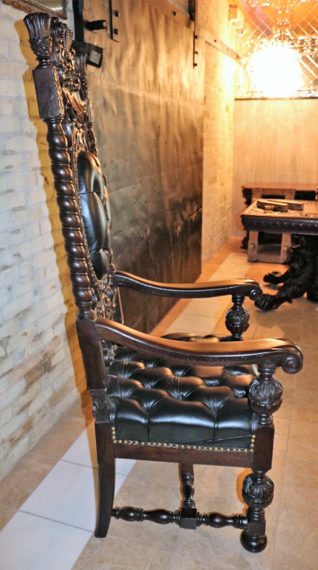 R. J. Horner (New York) Mahogany Crown Throne Chair and Black Leather Buttoned and Tufted