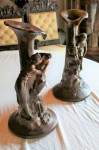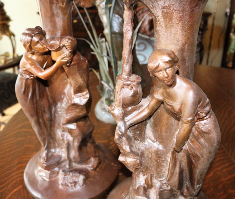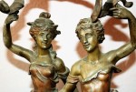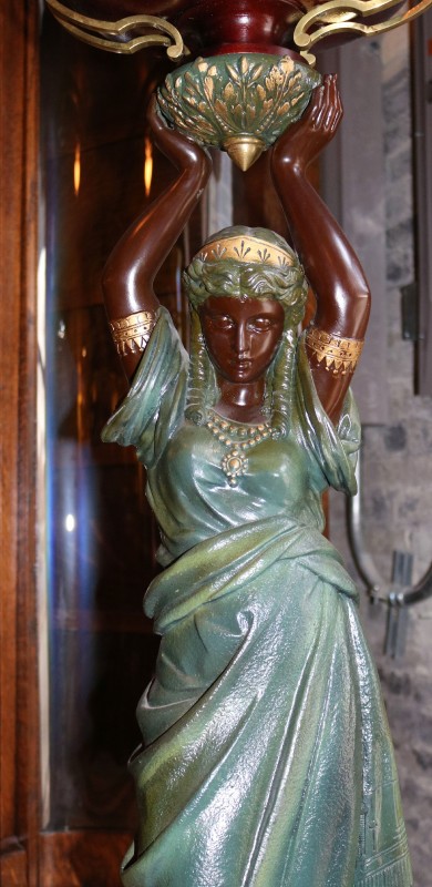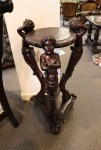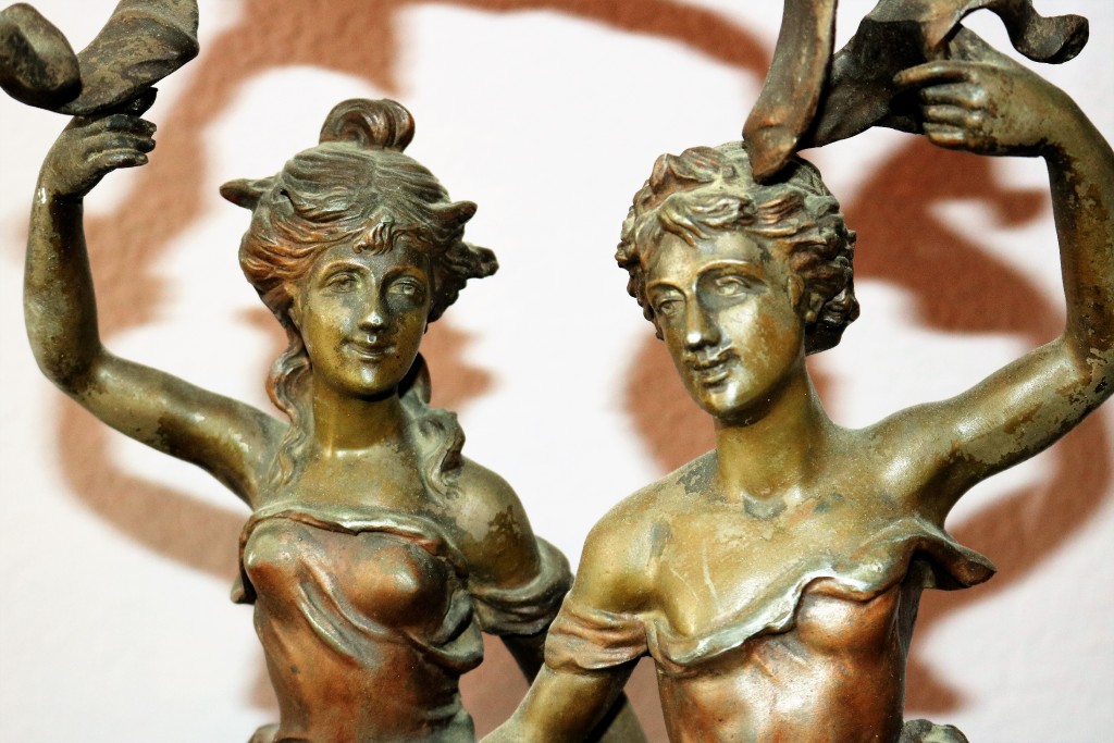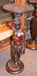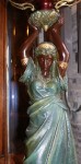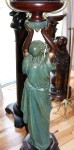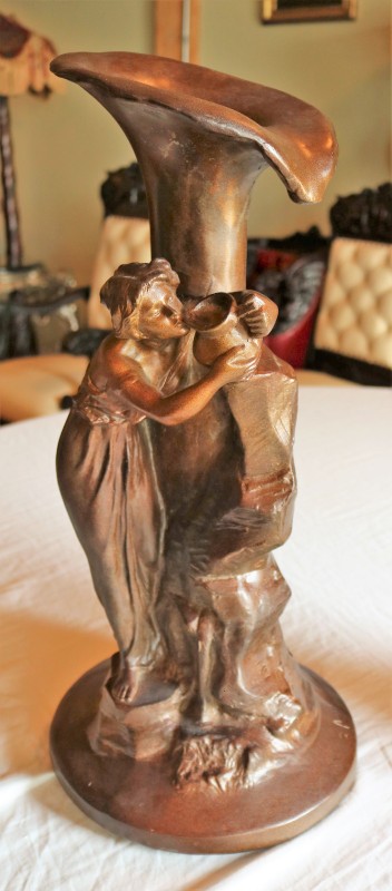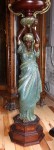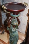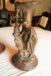 Spelter Woman with carved walnut bowl with brass inlays adornments