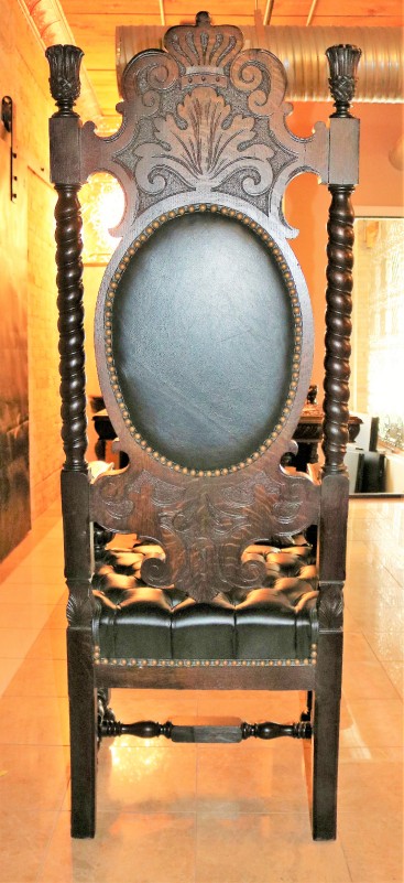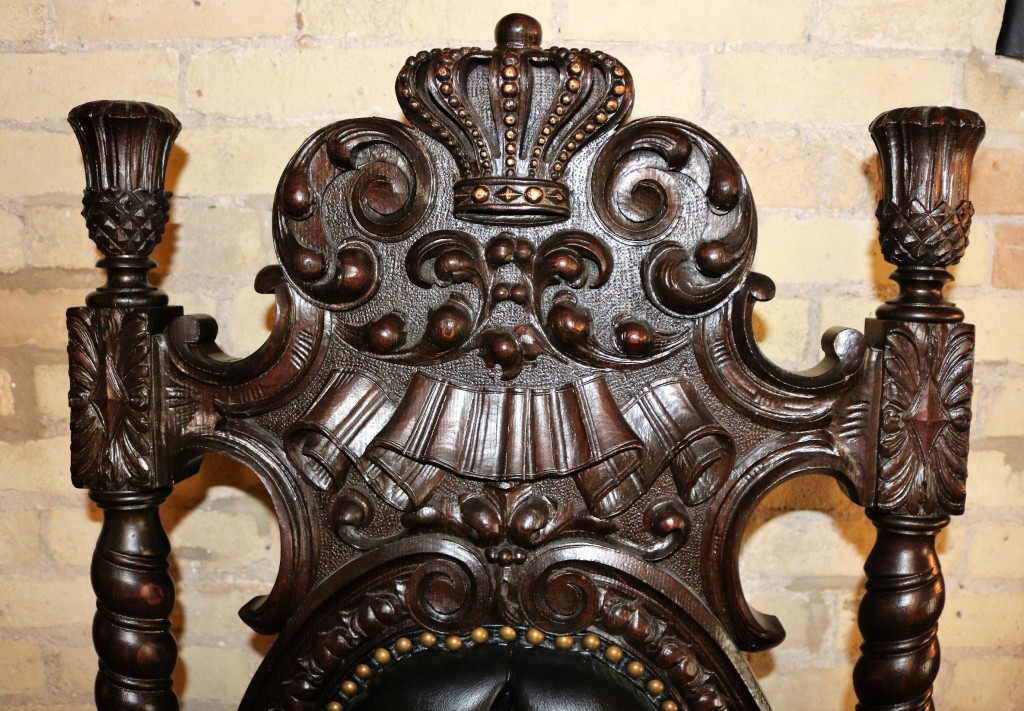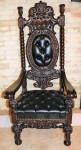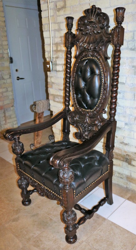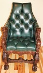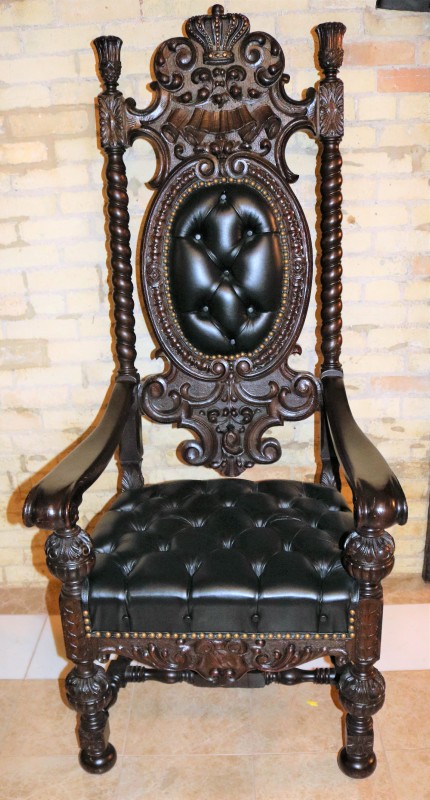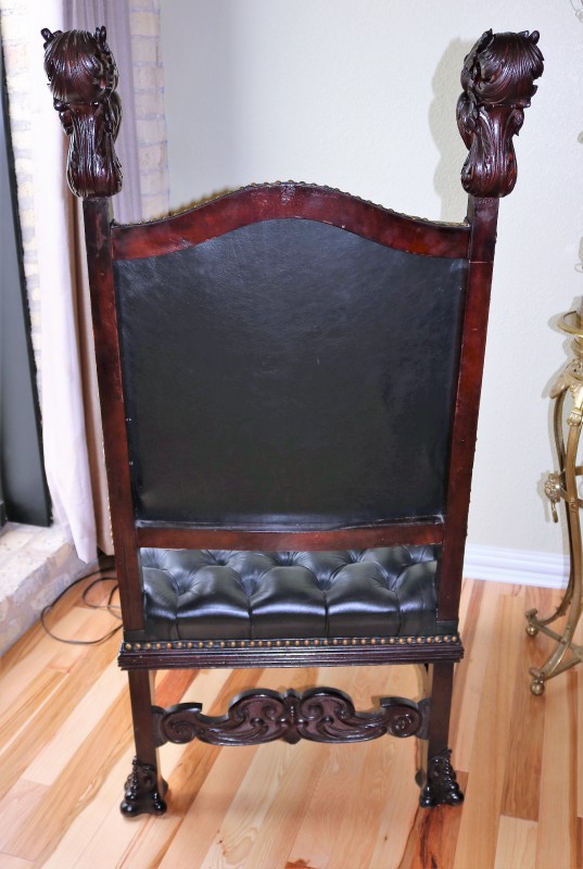 R. J. Horner (New York) Mahogany Crown Throne Chair and Black Leather Buttoned and Tufted